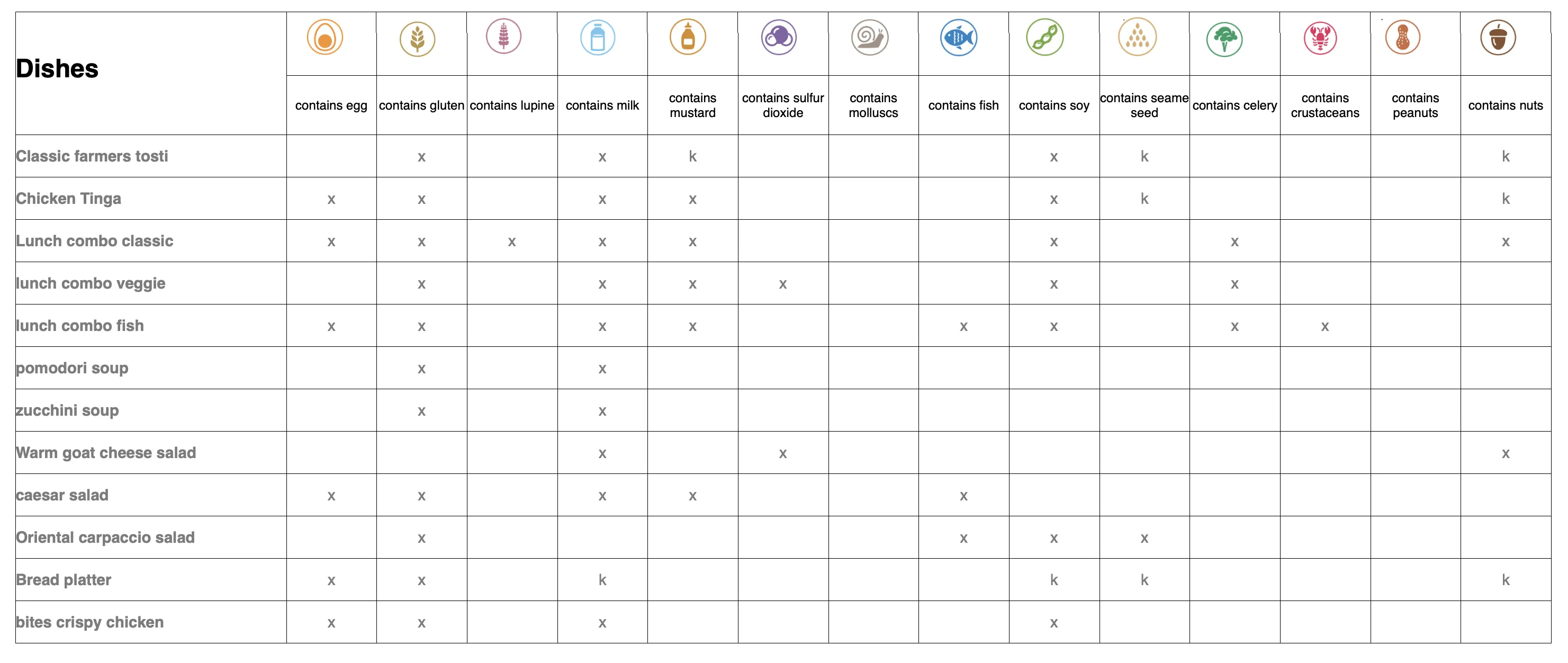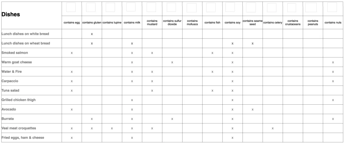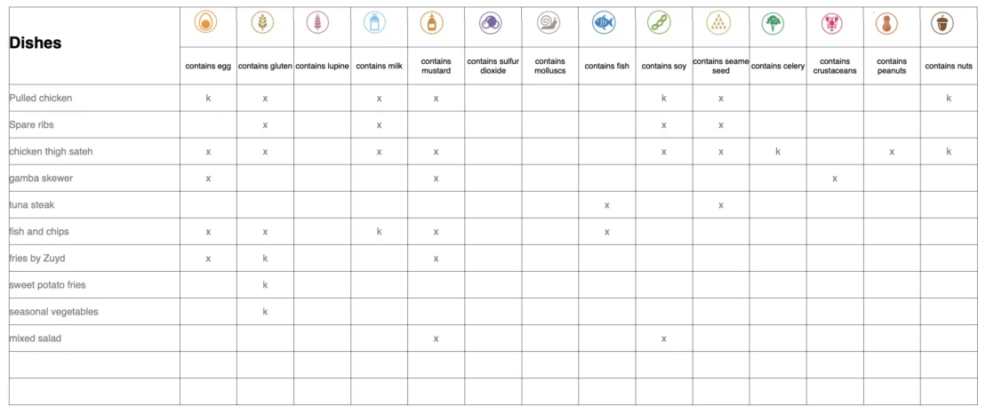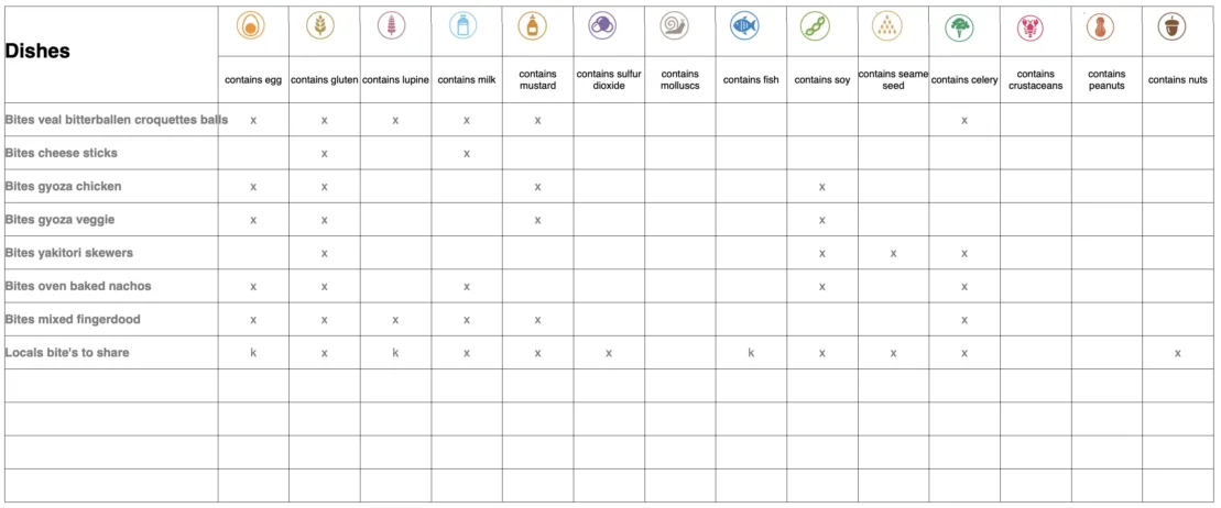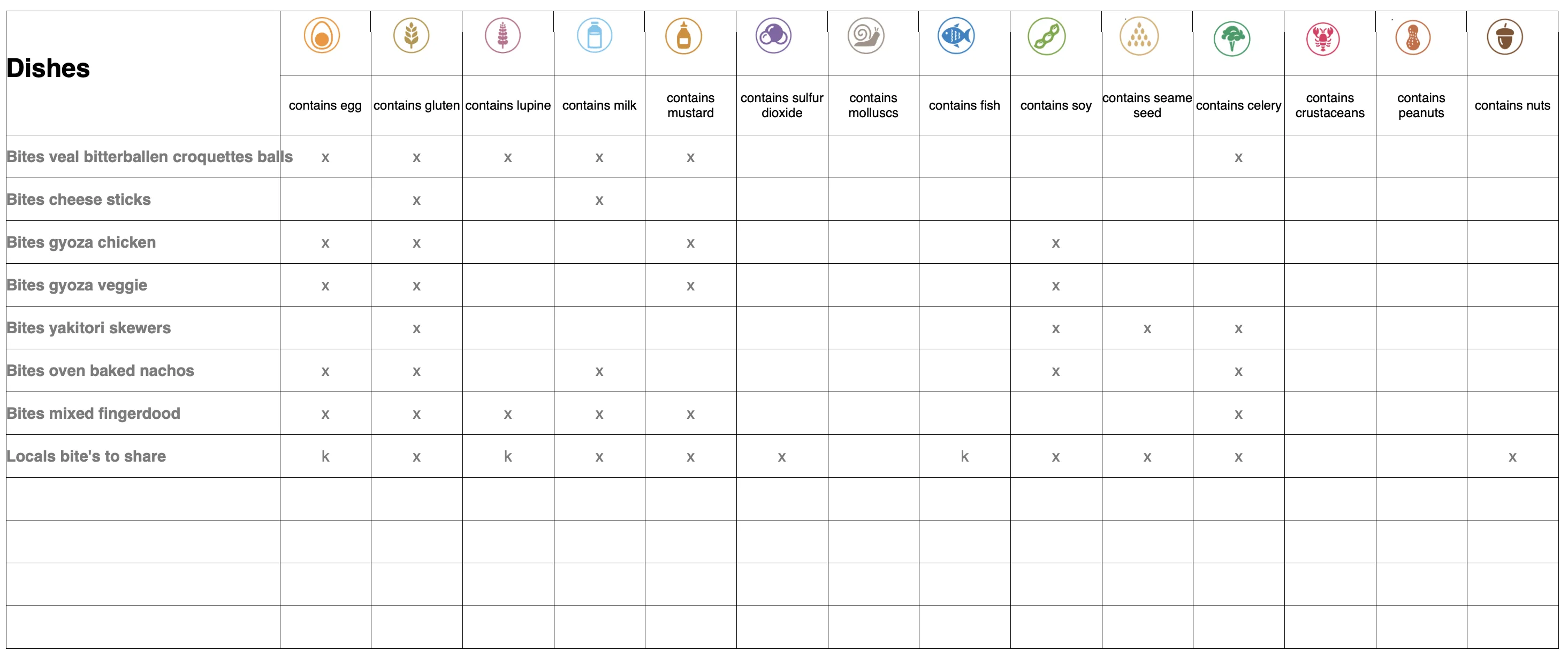 On this page, you'll find an overview of our dishes and their related allergens. This way, you can easily check what suits your dietary needs. Not sure about something? Please don’t hesitate to ask – our staff is happy to help!