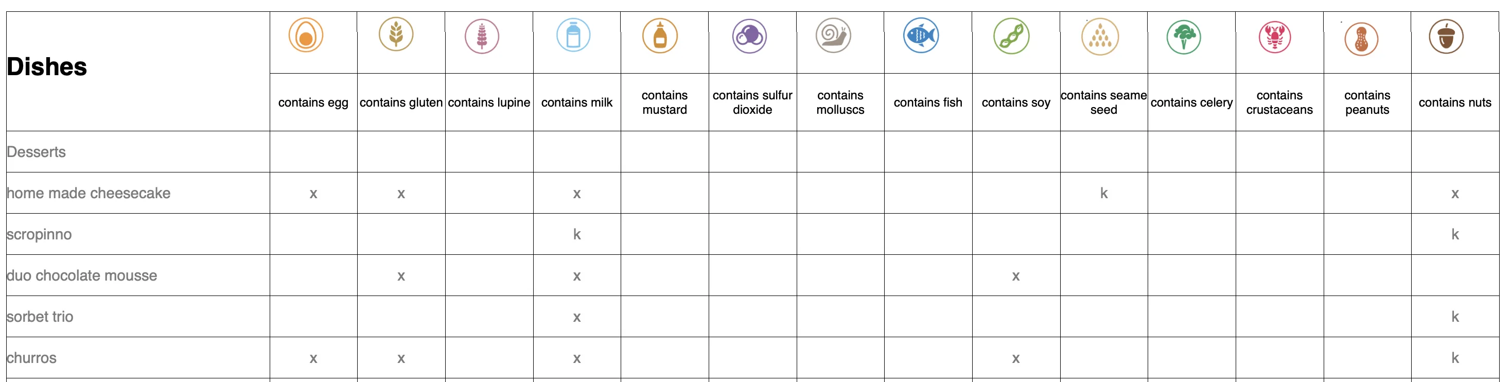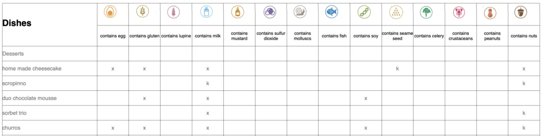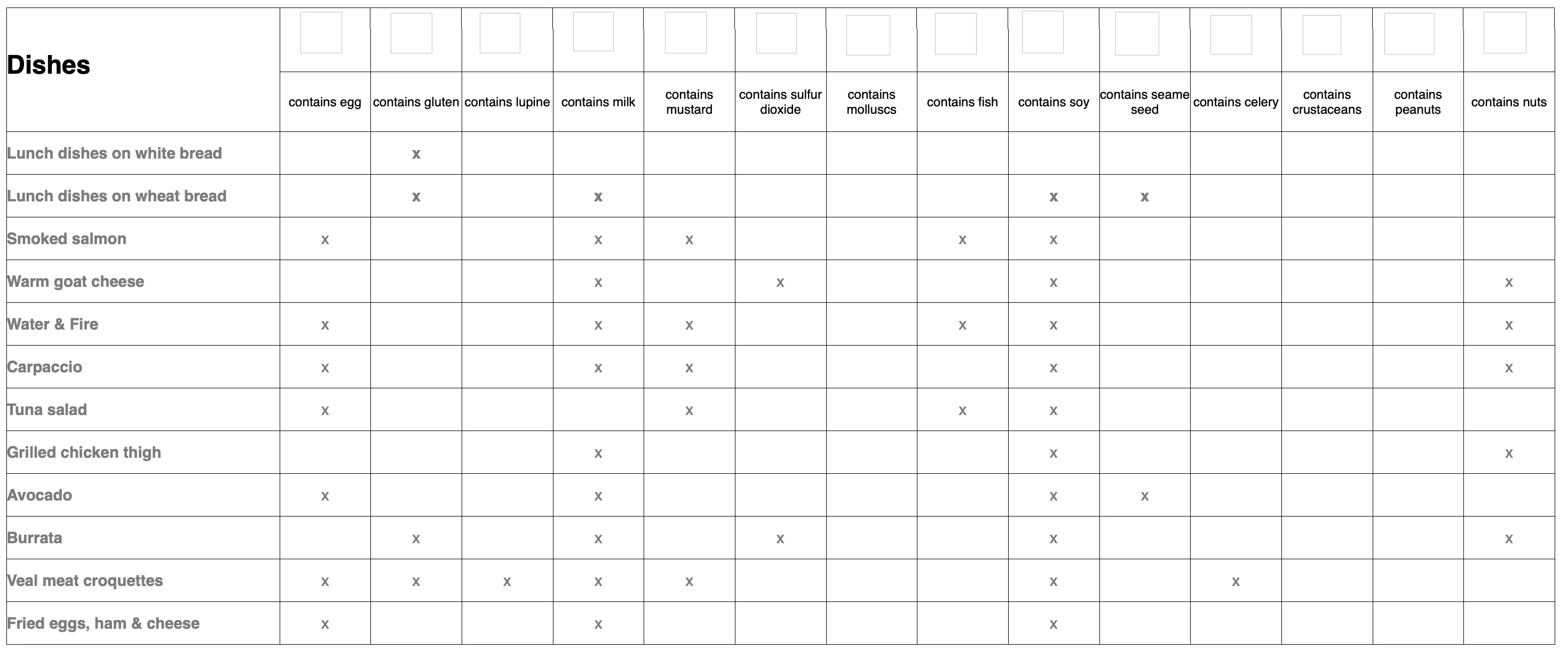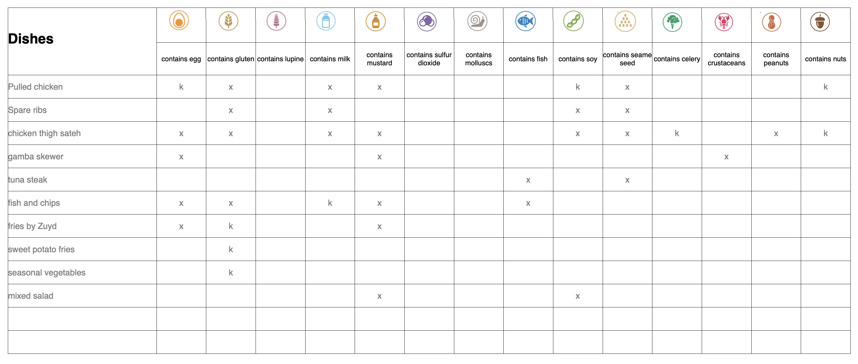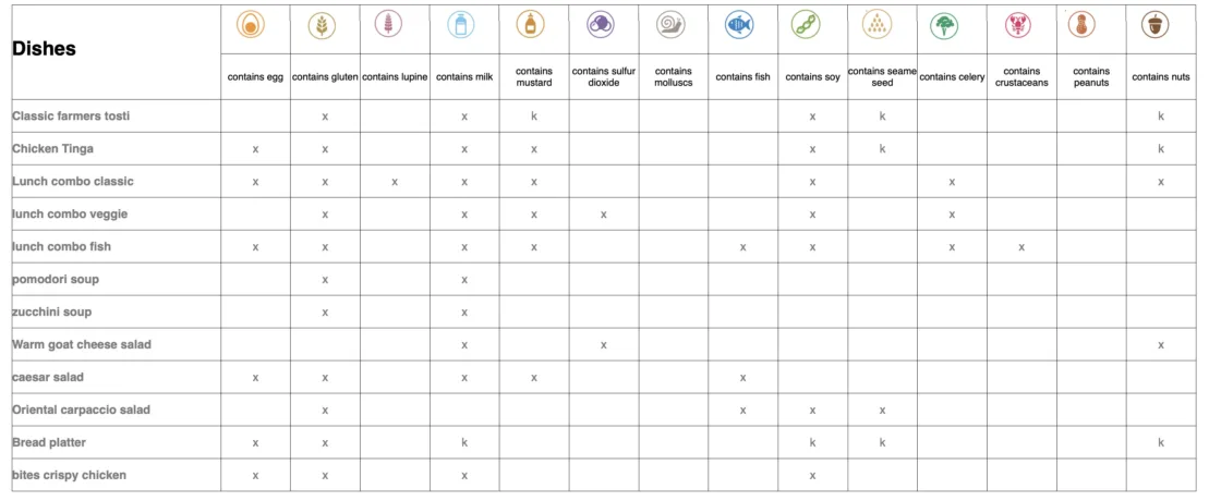 On this page, you'll find an overview of our dishes and their related allergens. This way, you can easily check what suits your dietary needs. Not sure about something? Please don’t hesitate to ask – our staff is happy to help!
